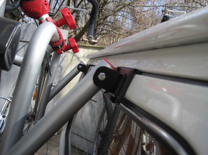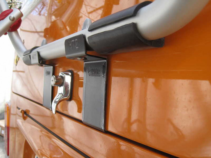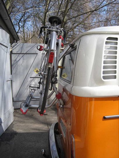 Unsere Fahrradträger-Lösung ist ein moderner Fiamma Carry Bike Träger für bis zu 35 kg. Er ist durch seine hauptsächlich aus Aluminium und Kunststoff bestehende Konstruktion extrem leicht und damit einfach anzubauen und unbeladen bleibt die geöffnete Heckklappe mit normaler Feder oben, hält die Fahrräder solide und man kann ohne Abzuladen die Motorraumklappe öffnen.