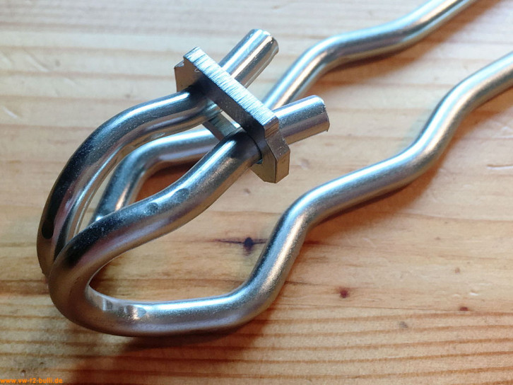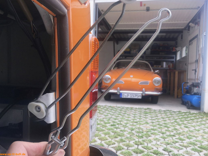 Da die Motorklappe bei beladenem Fahrradträger nicht ganz nach oben geklappt werden kann um auch dort einzurasten (um 36 Grad), gibt es bei www.werk-4.com auch eine abgeänderte Motorklappenfeder mit einer zusätzlichen Zwischenrastung (um 12 Grad). Damit bleibt die Motorklappe auch mit Fahrradträger offen.