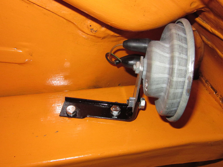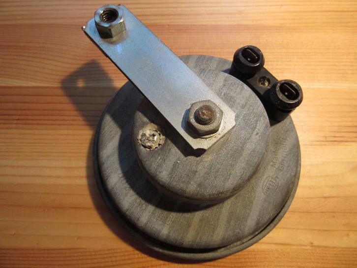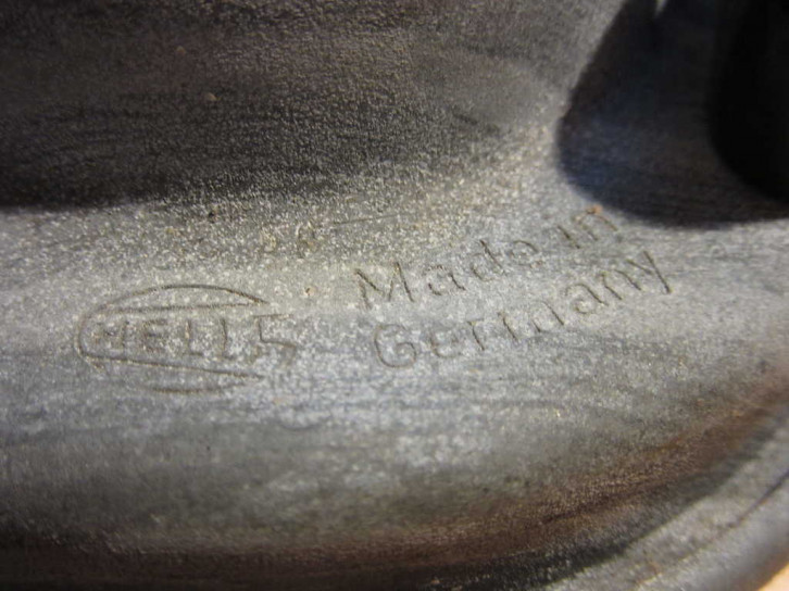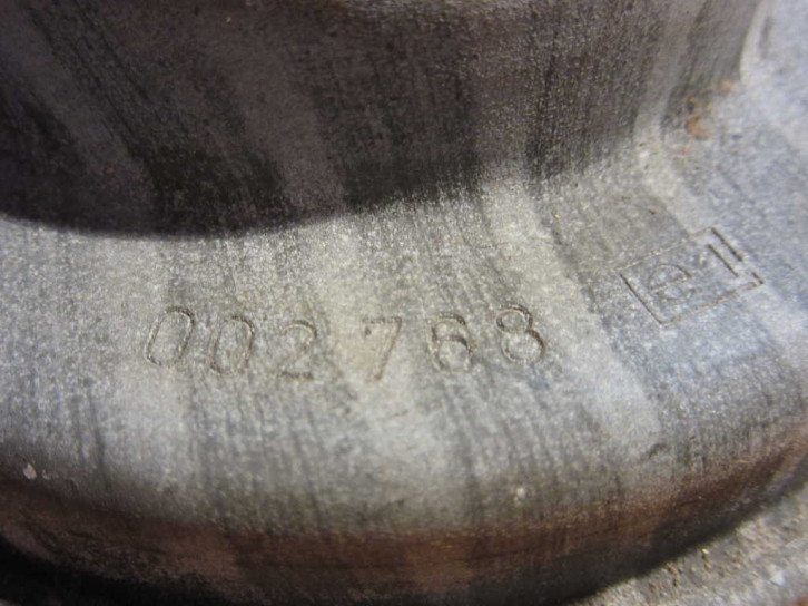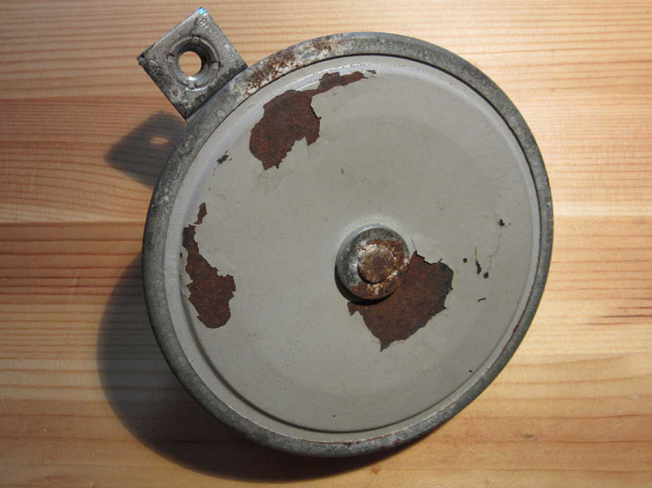 Die Hupe ist eine verpresste (nicht verschraubte) Hupe von "Hella" mit 11cm Durchmesser. Bestellnummer ist möglicherweise "002768". Daneben ist noch das e1 ECE-Prüfzeichen für Automotive Zulassung aus Deutschland und die Nummer "71327" lesbar.