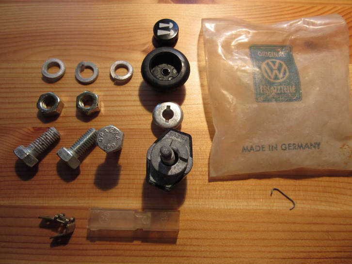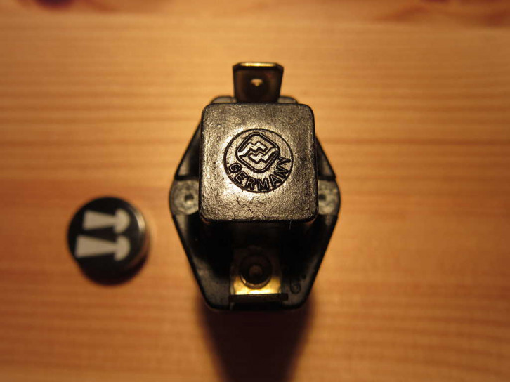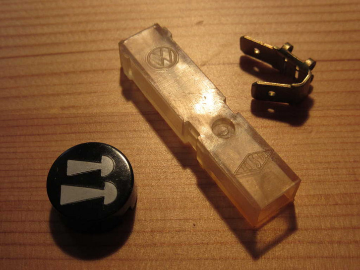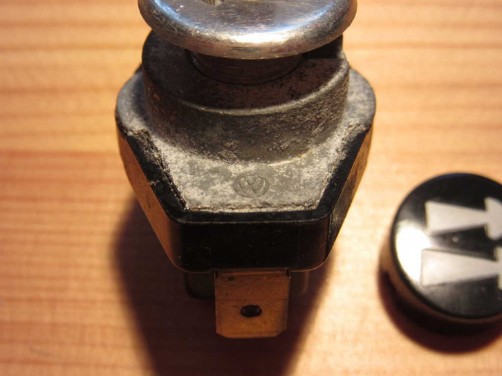 Die beiliegende Schalter ist identisch dem Zugschalter für die Innenraumbeleuchtung mit VW Teilenummer 111 955 511 B.Er stammt trotz VW Zeichen nicht wie üblich von Hella - sondern trägt ein MW-Firmenzeichen der Firma Merit-Werk Merten GmbH & Co KG, Gummersbach (der automotive Schalterbau wurde erst stückweise nach Malta verlegt und dann als MERIT Malta 1997 an Methode Electronics Ltd verkauft). Auch der Knopf stammt nicht von Hella sondern von der auch bekannten Marke "Helphos" (aus Bad Harzburg, 1996 durch die Firmengruppe "Solvay" übernommen).