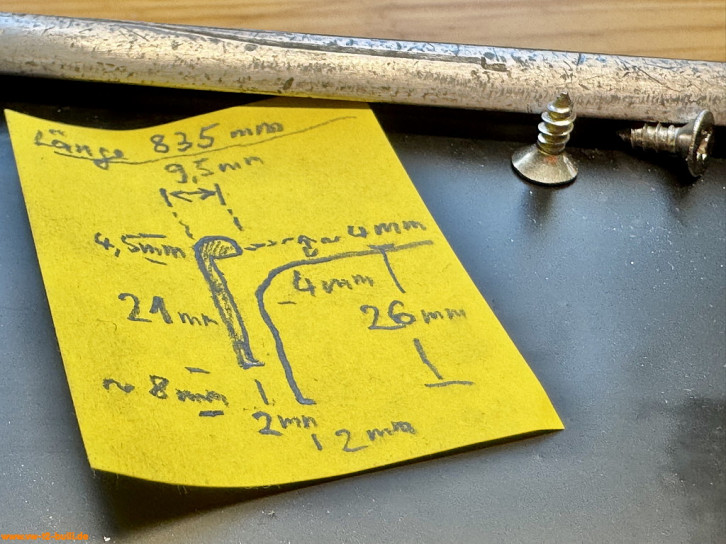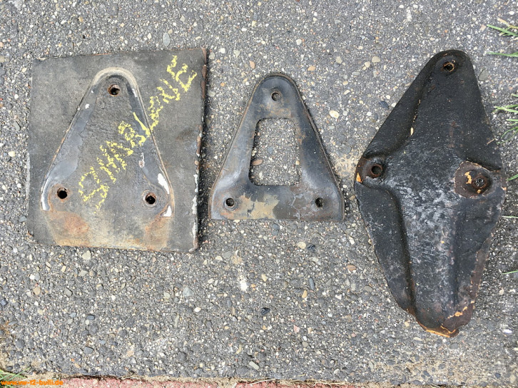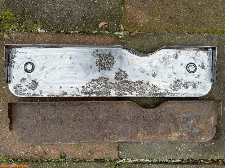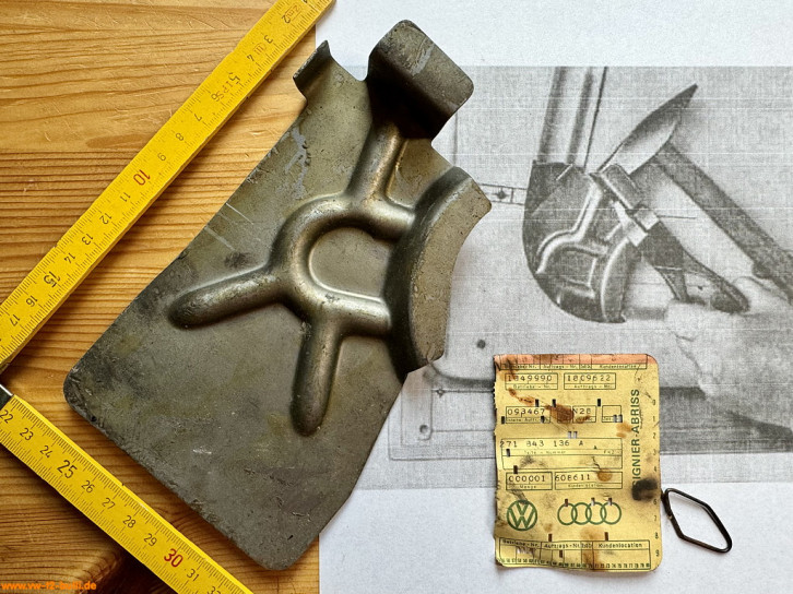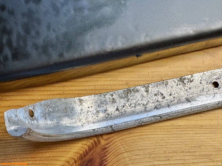 Auf der Suche nach Anbauteilen habe ich auch noch ein zweite unvollständige Trittstufe erhalten, die in den Ausmaßen kleiner ist - beide sind 76,5 cm lang, aber die mit T2b Halterungen war 19 cm tief, die andere nur 16 cm - möglicherweise unterschiedliche Größen über die Jahre für den T2 - oder gar noch T1 mit Schiebetüren ab 1963... Der Haken am Fangarm daran hat aber die Form des Reparaturleitfaden "Aufbau" von 1969 und nicht des hier sonst gezeigten vom T2b. Das Rätsel ist noch zu lösen. Auch für T3 ist 76,5 cm lang und 19 cm tief. Untererschiedlichen Varianten oder genaue Ausmaße sind nicht durch VW belegt.