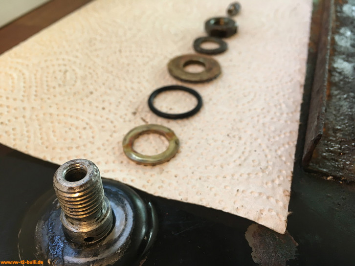 Zwei Messingringe haben für den Durchfluß von Fett eine Art Nut von einem zum anderen Rand, der auf der Rückseite um 90 Grad gedreht ebenso existieren. Darum liegt je eine Gummi O-Ring (VW# 111 501 296, 25 x 2,6 mm). Die anderen beiden Messingringe sind auf einer Seite eben, auf der anderen haben sie am Rand Platz für je einen anderen Gummi O-Ring mit ca. 41 x 2,6 mm. Dann auf der anderen Seite der Halter ein Federring und Sechskantmutter. Am Ende dann zur Schmierung dann je ein Druckschmierkopf bzw. Schmiernippel (VW# N 018 515 1, 6 mm).