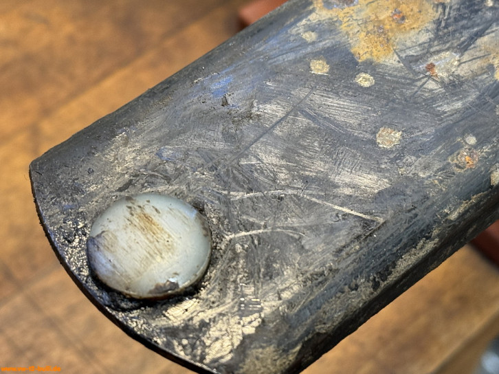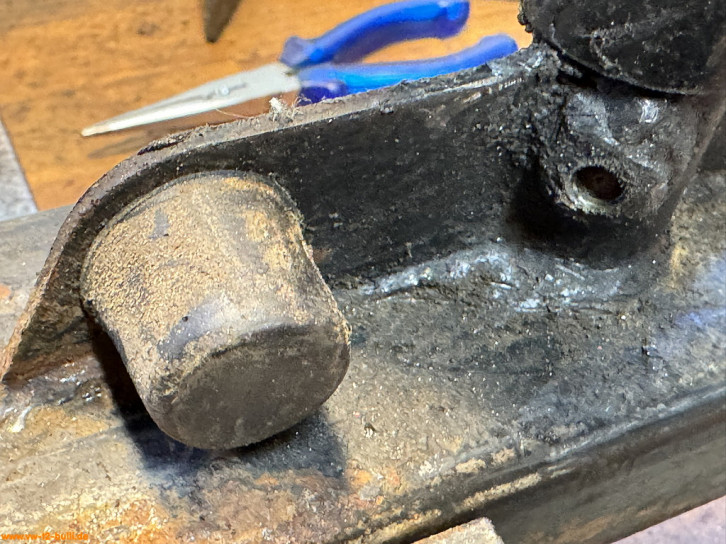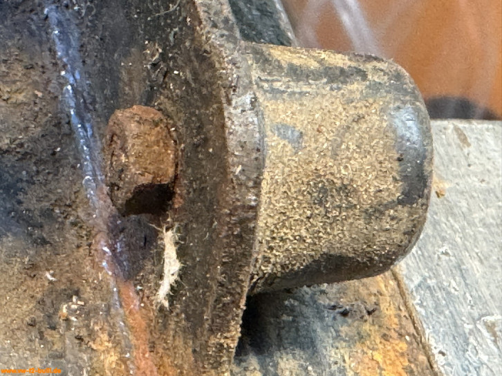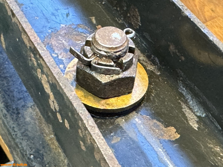An den Drehgelenkachsen ist je ein Druckschmierkopf bzw. Schmiernippel (VW# N 018 515 1, 6 mm). Die Achsen enden unten in ein Gewinde. Auf diesem steckt ein Gummiring (ca. 32 x 2,5 mm), eine Messingscheibe (32 mm) zum Halten des Fettes - und am Ende eine Kronenmutter fixiert durch einen Splint.