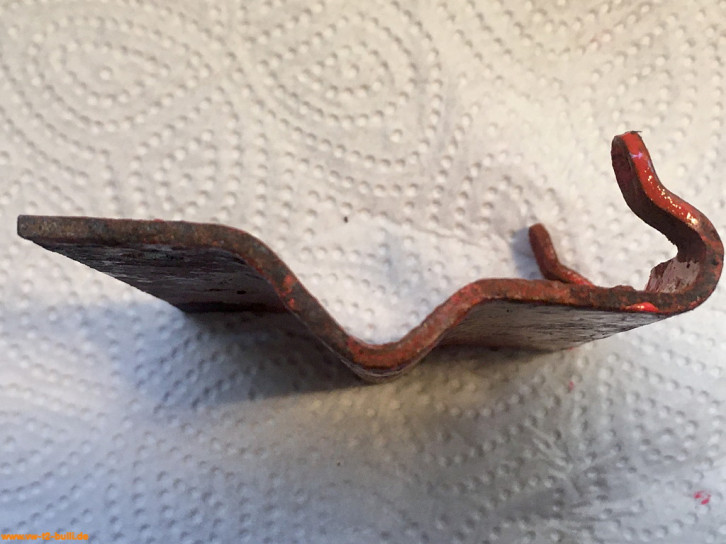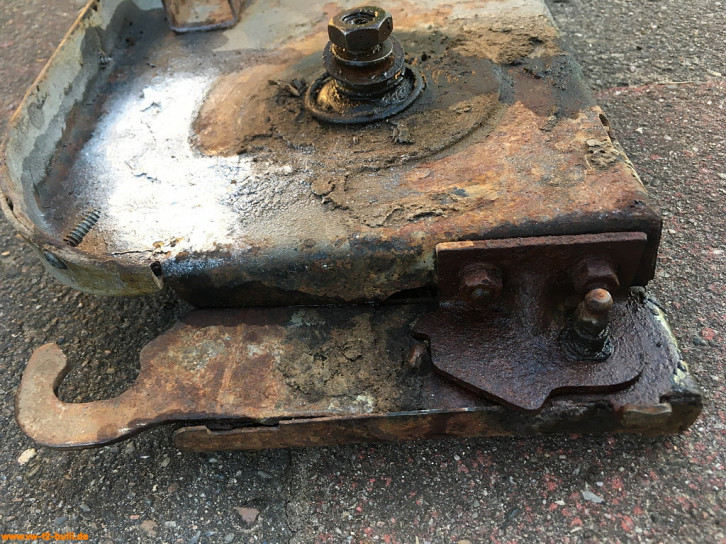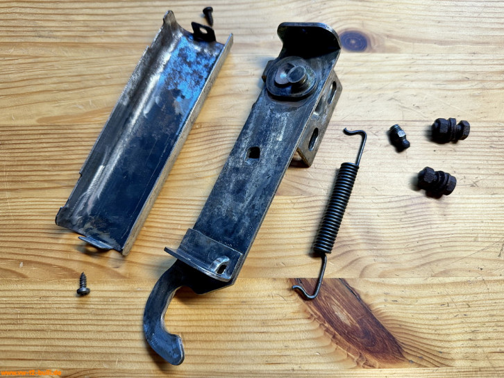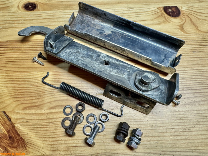 Rückzugsfederhalter zu montieren mit M6 Schrauben am Längsträger für die Rückzugsfeder (VW# 271 821 891) und mit Gummipuffer (VW# 211 843 749) als Anschlag für den ausgefahren Zustand der Trittstufe. In Bilden alte gebrauchte und neue Feder.
