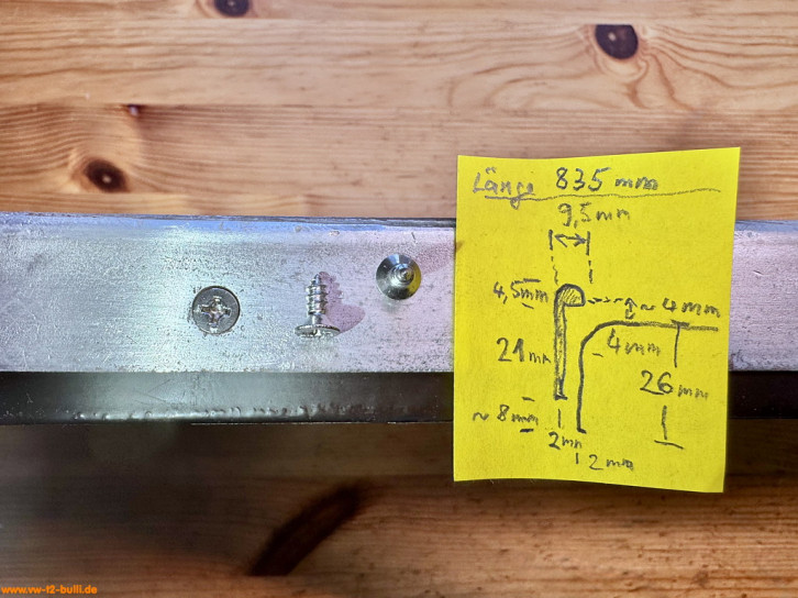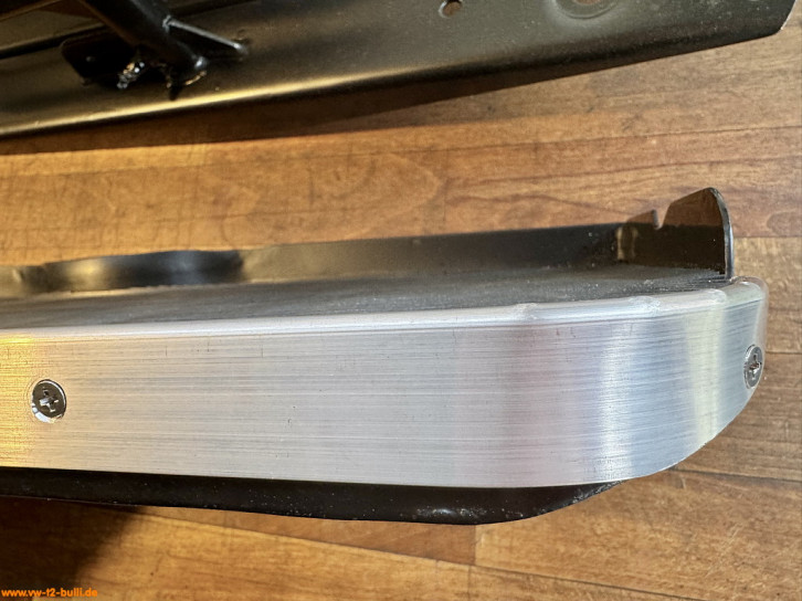 Die Trittfläche wird nach außen eingerahmt durch eine eloxierte Aluminium Zierleiste. Das Profil dieser Abschlußleiste sieht im Querschnitt aus wie ein Halbkreis oben und anschließend eine rechteckige Leiste. Gehalten wird sie mit 7 Linsensenkblechschrauben (VW# N 014 086 4, ST3,5X13-C, 3,5 x 13 mm). Diese Zierleiste deckt nicht die gesamte Kante der Trittbretts bis nach unten ab (im Gegensatz zur T3 Version), sondern wirkt optisch filigraner und endet ca. 8 mm über der Unterkante - darunter ist je nach Lichtverhältnissen der Rest der schwarzen Trittbrettkante zu sehen. Ich habe die alte, verkratze und ausgerissene durch ähnliche Meterware ersetzt: ALBERTS Abschlussprofil, Alu, natur, EAN 4004338470326, 26x6x1.3 mm in 2 m Länge.