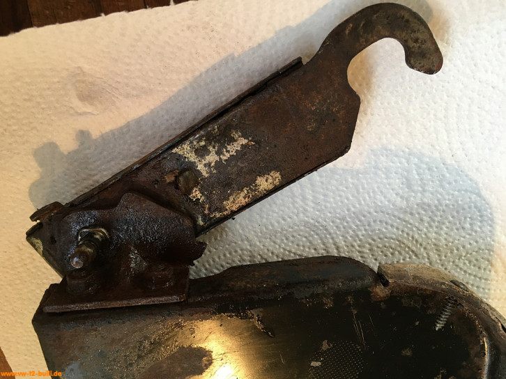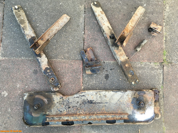 In VW Bildkatalog 068-10 und VW Reperaturleitfaden für Aufbau A21.2 ff sind nicht alle Kleinteile ersichtlich. Die Schwenkgelenke und der geferderte Haken haben Schmiernippel für Fett. Die Mechanik erlaubt das einpressen von Fett z.B. durch Unterlegscheiben mit Aussparrungen dafür. Ausserdem halten Gummiringe das Fett. Der Federmechanismus des Hakens ist bei VW kaum ersichtlich. An den Schwenkarmen sind je 5 Kunststoffgleiter eingesteckt, die Klappern vermeiden.