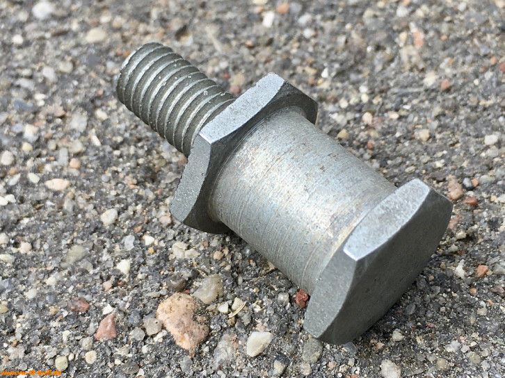 Der unten angebrachte Mitnehmerzapfen (VW# 271 843 857) nutzt ein M8 Gewinde, befestigt mit Unterlegscheibe (VW# N 011 525 20, 8,4 x 16 x 1,6 mm), Federring (N 012 038 7, für 8 mm) und Sechskantmutter (VW# N 011 008 8, M8).
