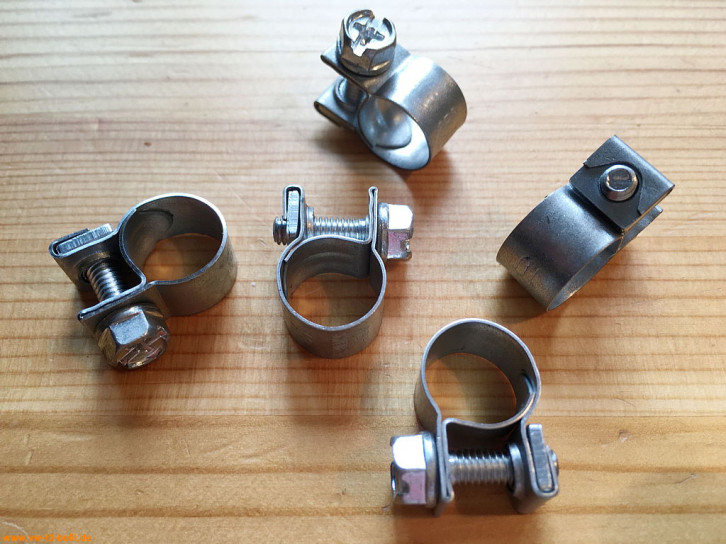 Die Kraftstoffschläuche sind zwar aussen 11,5 mm, wenn man sie aber auf Adapter und Röhrchen aufschiebt brauche ich eher Schlauchschellen mit 12-14 mm und nehme meist welche gleich aus Edelstahl.