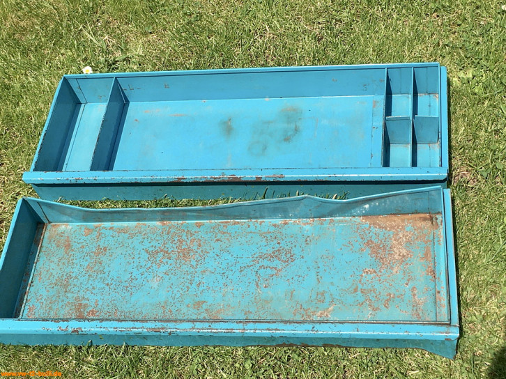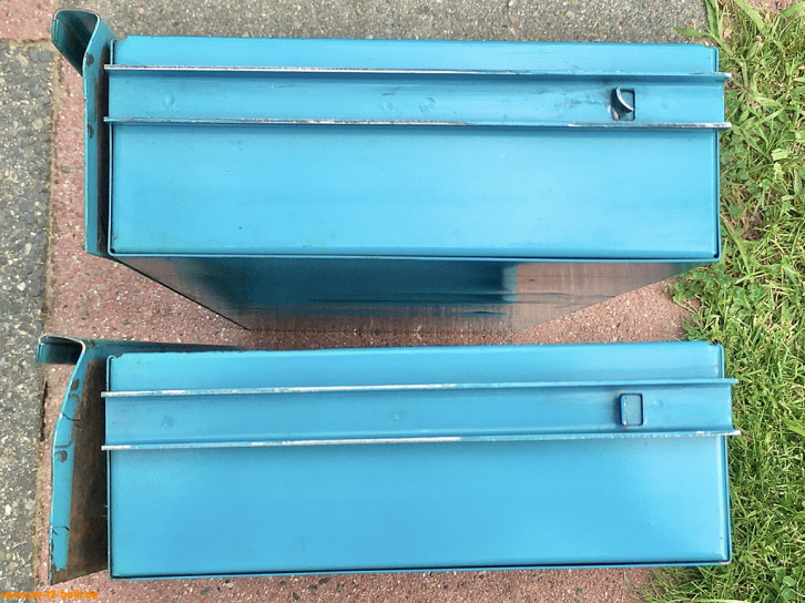 Der Werkzeugschrank ist hellblau lackiert auch innen und unten - nur die Rückwand ist grau.