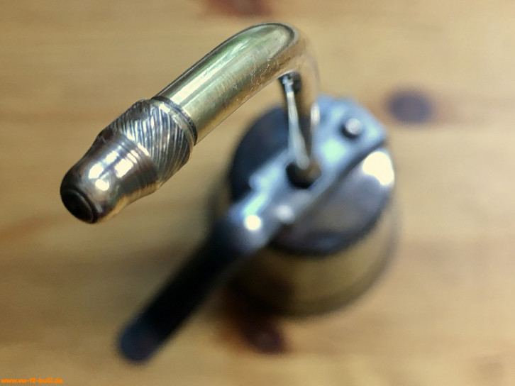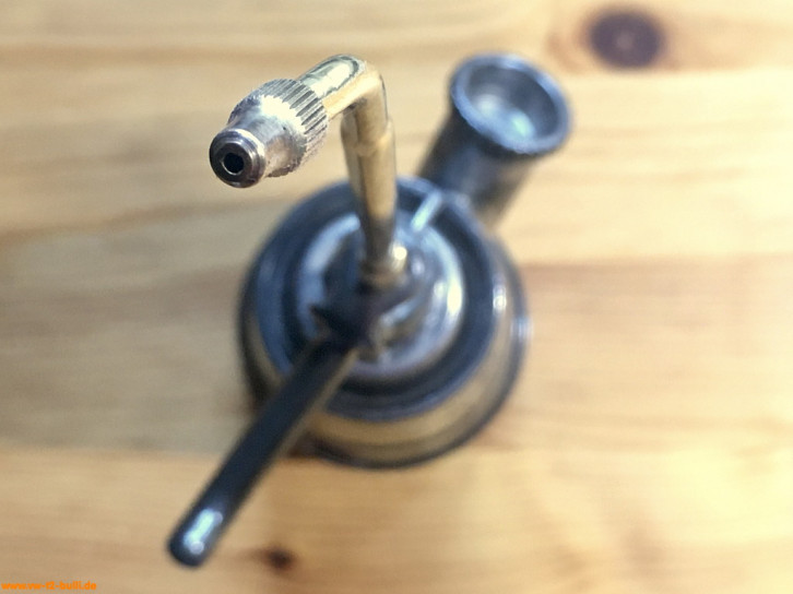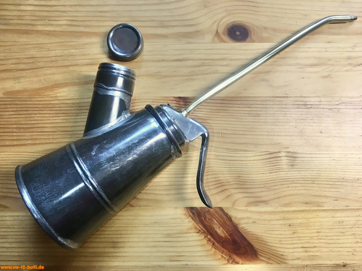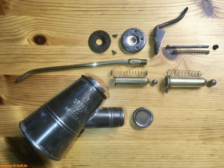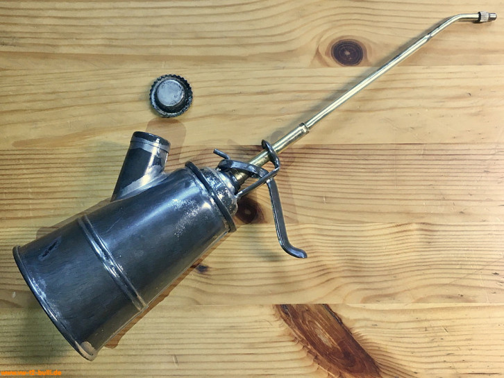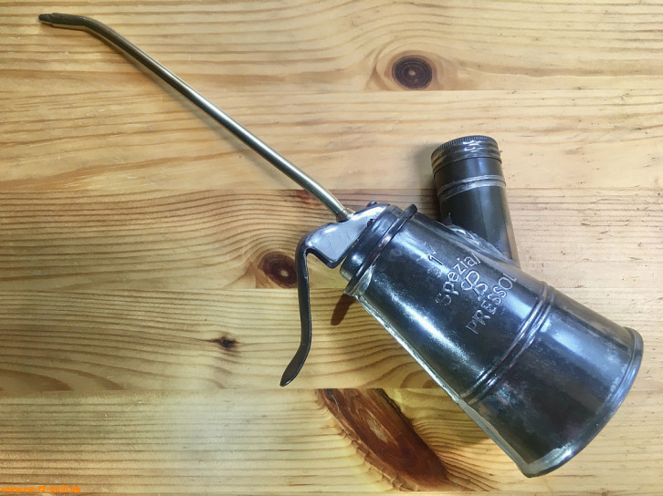 Randbemerkung: dieses und andere Ölspritzkännchen sind von HAZET zugekauft und stammen mindestens ab 1958 von der Firma Pressol (gegründet um 1914 von Jakob Preßl). Ähnliche Pressol Spezial Öler in Größe 2 werden auch heute noch gebaut, aber ohne Messing, mit einfacher geformten Dosierhebel und mit Kunststoffdeckel.