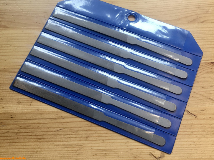Um 1949 waren die Feilen auch schon Teil von Werkzeugkästen, aber ohne eigene Bestellnummern. Die hier gezeigten sind mit Holzgriff, wie es sie ab 1958 auch einzeln mir Bestellnummern gab . Ab 1985 bis heute 2021 gibt es diese dann mit schwarze Kunststoffgriffen.