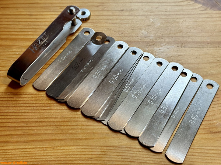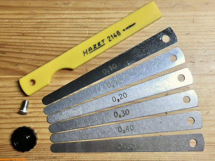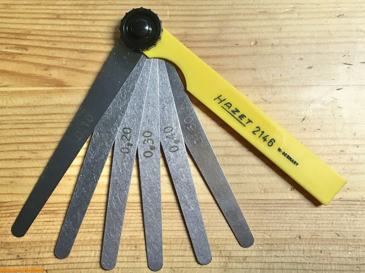 Aufschriften sind "HAZET 2146" und klein "W-GERMANY" auf dem Griff - und die Größen "0,10", "0,15", "0,20", "0,30", "0,40" und "0,60" auf den Fühlerlehrenblätter.