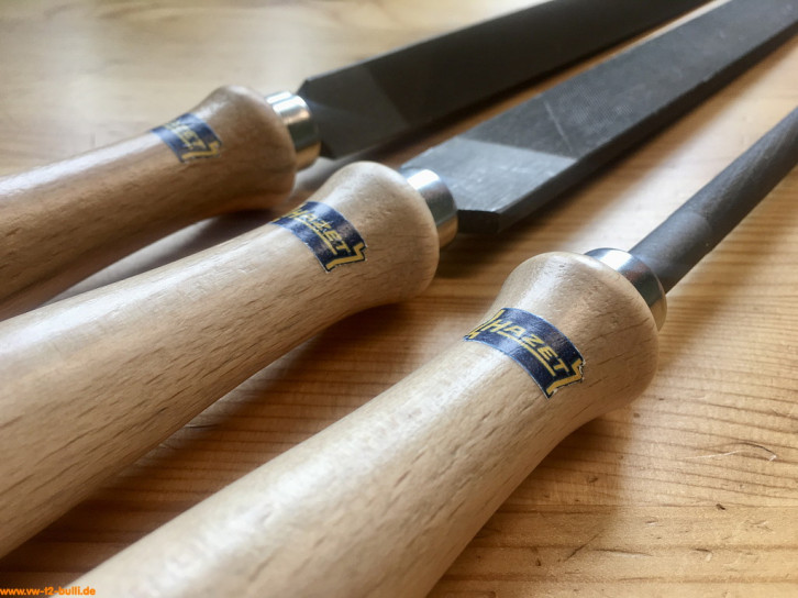 Alte, brauchbare Originale habe ich bisher nicht finden können - Feilen sind aber auch Verbrauchsmaterial. Daher hier nur von mir nachgestellte Versionen (zusammengebaut aus je 250 mm Feilenblatt der Firma FORTIS und No-Name 110 mm Holzgriff, Holzgriff lackiert und mit selbstgemachtem Wasserschieber-Logo verziert).