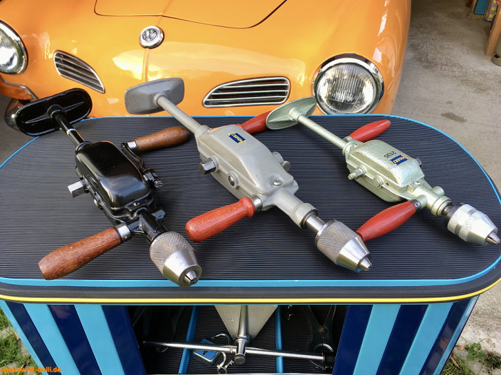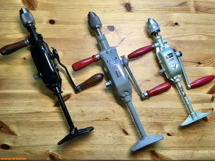Diese 420/440/340 mm langen und 2300/2240/1290 g schwere Handbohrmaschinen bis 13 mm waren Teil von Werkzeugschränken. Der Kurbelgriff kann an zwei Stellen des Getriebes befestigt werden für zwei unterschiedliche Geschwindigkeiten. Der zweite, fixe Griff kann von einer Seite zur anderen getauscht werden.