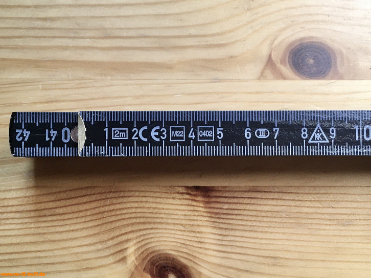 Einfacher 2000 mm langer Gliedermaßstab alias Zollstock aus schwarz lackiertem Buchenholz, durchgehender Anreißkante und mit einfacher EG-Genauigkeitsklasse III (bei 2 m bis zu 1.4 mm Abweichung - größere Genauigkeitsklasse II gelten nur mit Fiberglas oder Metall erreichbar - aber einige meiner alten hatte nicht mal Klasse III und gelten daher nicht mal als Messwerkzeug).
