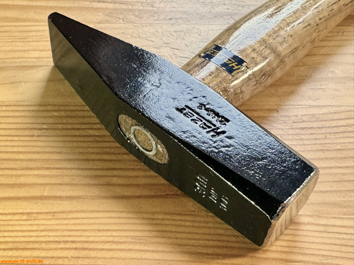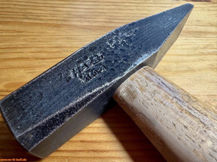 Dieser 280 mm lange und 200 g schwere Schlosserhammer mit Holzgriff aus Hickory (sehr hartes, belastbares und haltbares Holz aus Walnussgewächs) war Teil der Werkstattausrüstung für luftgekühlte VWs.