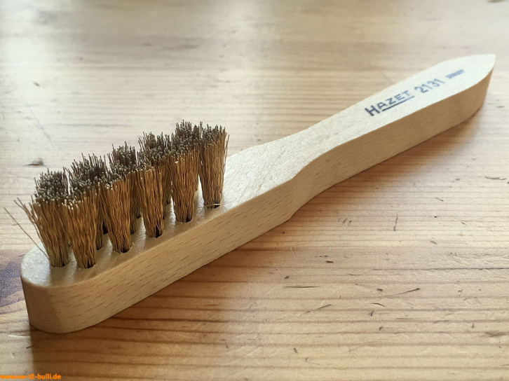 Einfache Drahtbürste aus Holz mit einer Gesamtlänge von 290 mm, 4-reihig mit 25 mm Länge, war Teil der HAZET Werkstattausrüstung für luftgekühlte VWs.