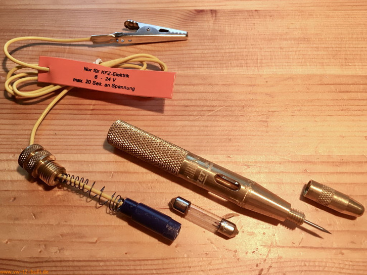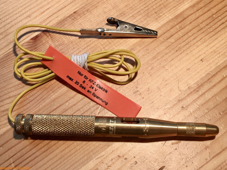 Autolicht-Prüfer zur Kontrolle der Licht- und Zündanlage an Kraftfahrzeugen von 6-24 Volt mit Prüfspitze. Für VW war ein ähnlicher Prüfer 2153-1 vorgesehen mit 4,5 mm Schraubendreherklinge als Spitze.