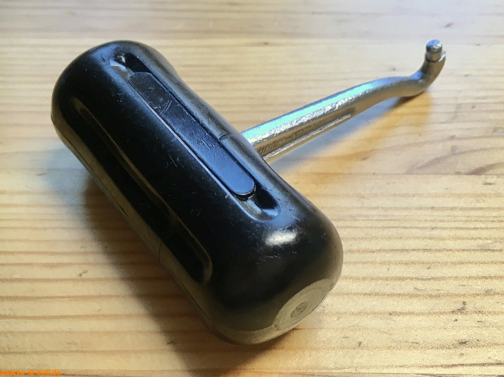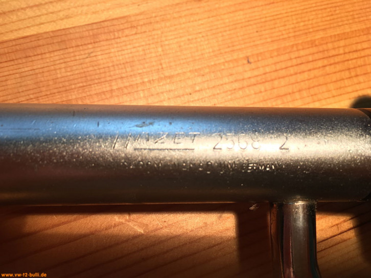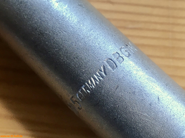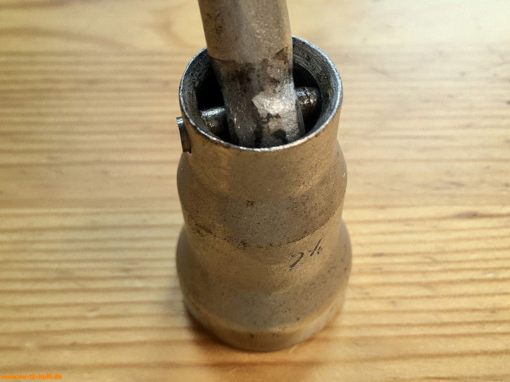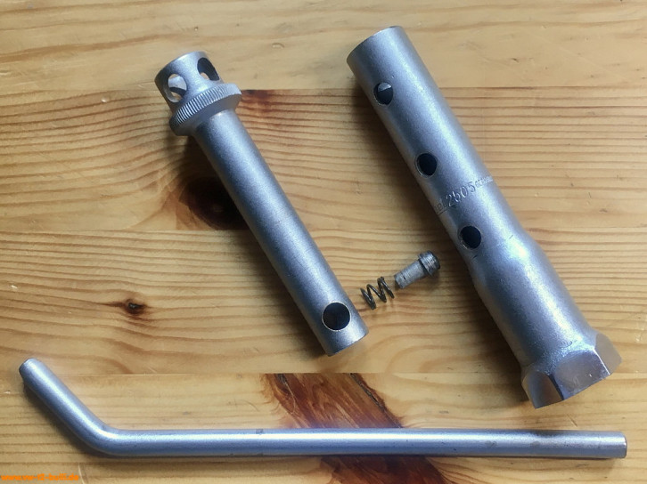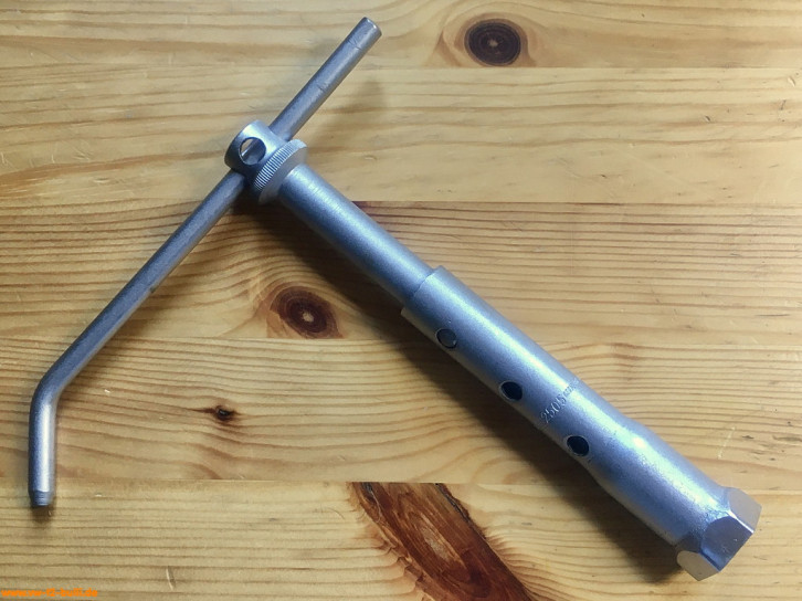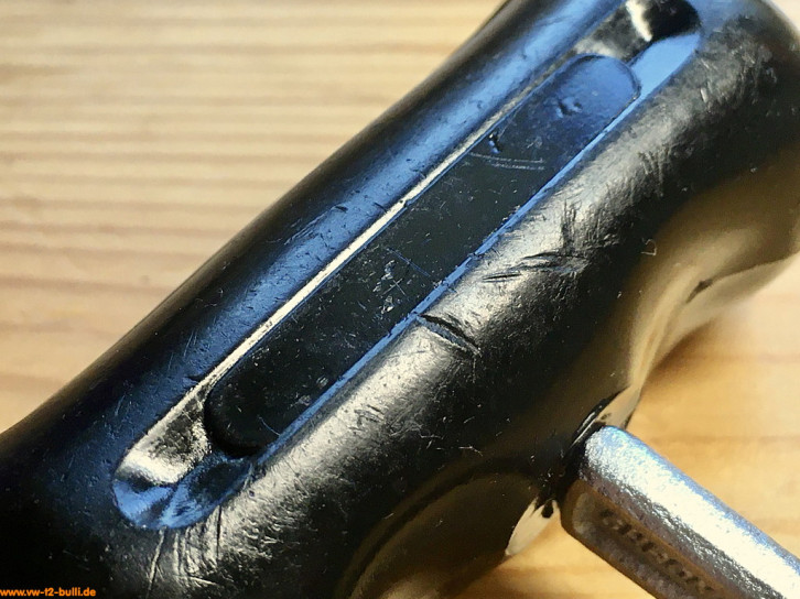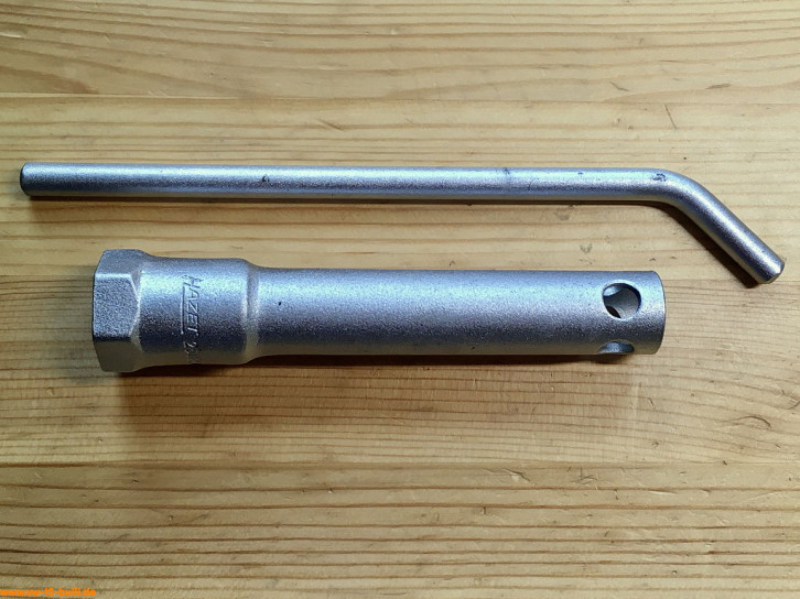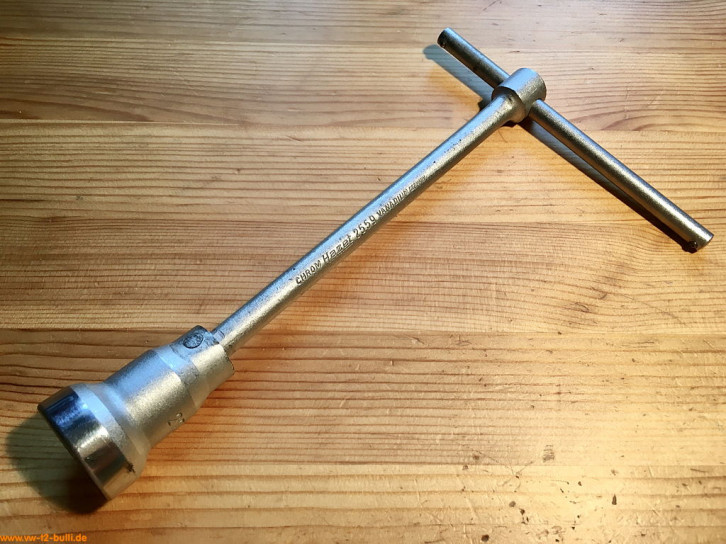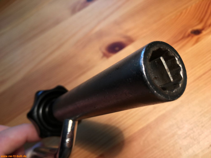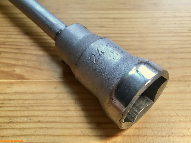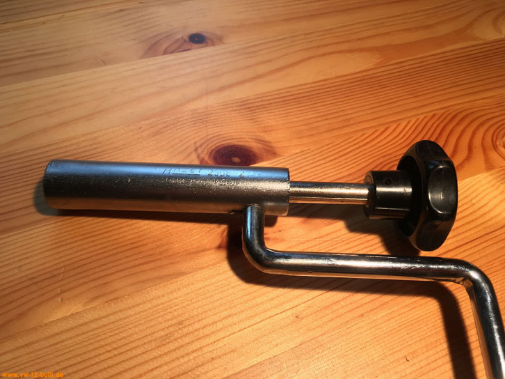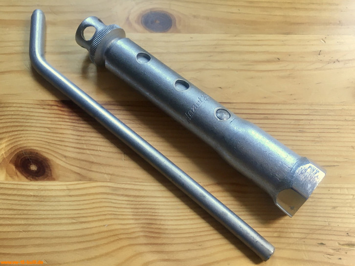Ein mit einer Länge von 135 mm einfacher Zündkerzenschlüssel für 20,5 mm mit 150 mm langem Stecker (wahrscheinlich nicht der Originale). Für einen Typ 4 Motor eher zu kurz und fummelig. Als kompaktes Bordwerkzeug für einen Typ 1 Motor vielleicht noch ok.