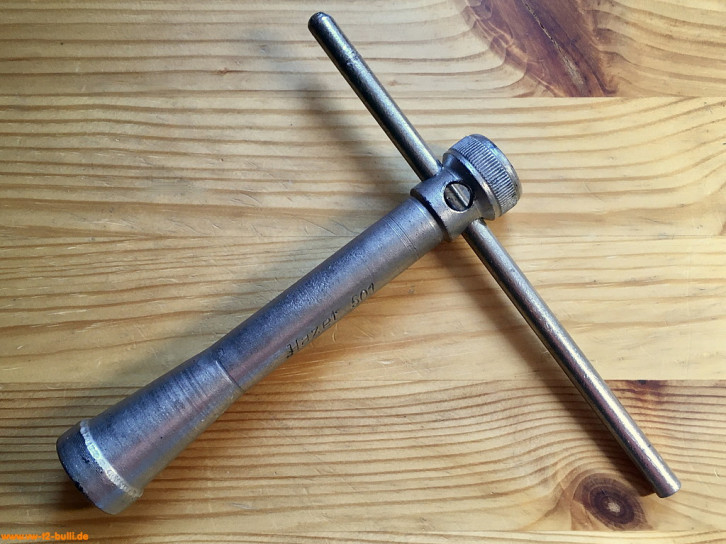 Dieser 300 mm lange T-Griff-Schlüssel mit 8 mm Innenvierkant diente zum Lösen und Anziehen der Spezialschrauben an der Schaltstangenkupplung und Schaltgabeln bei Typ 3 - und auch wie der kürzere "2514" Typ 1 und 2. Er entspricht dem Volkswagen-Sonderwerkzeug "VW 114".