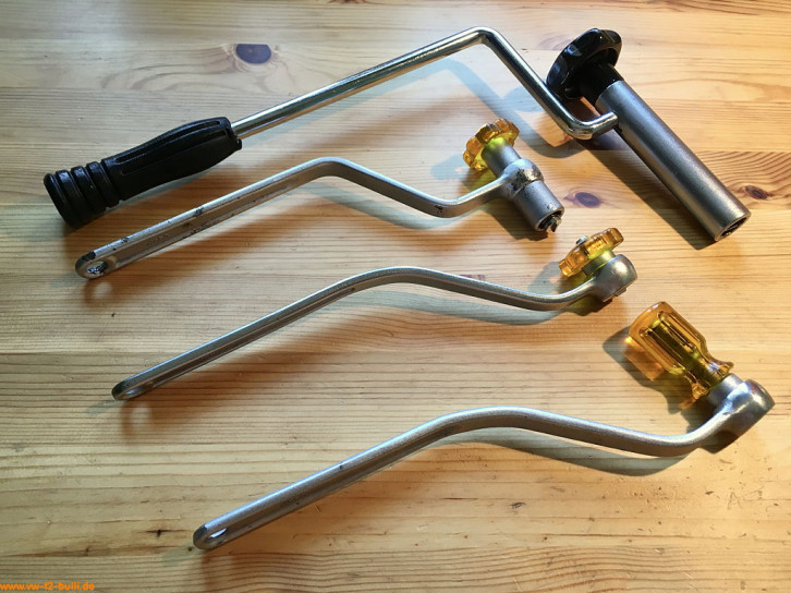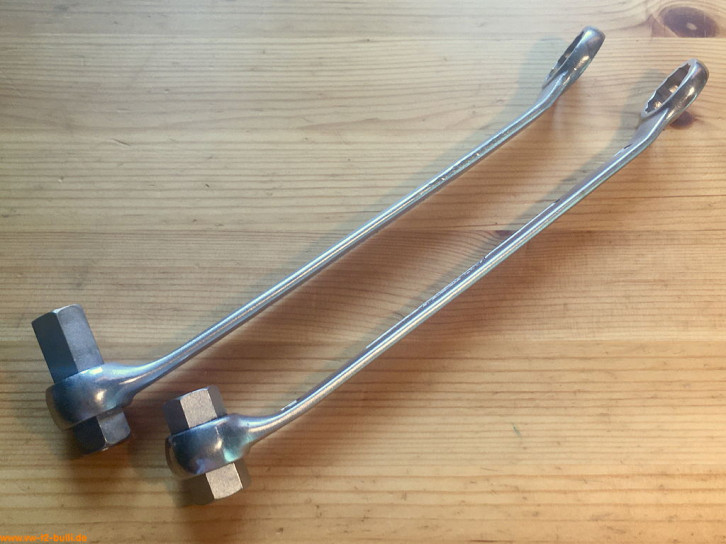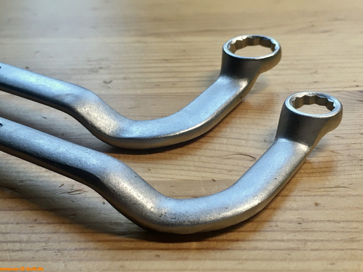 Der gebogene 205 mm lange Spezialschlüssel mit 10 mm Schlüsseln diente zum Nachziehen der Befestigungsmuttern des Ölpumpendeckels bis August 1967. Der andere mit 13 mm Schlüsseln diente zum Nachziehen der Befestigungsmuttern des Ölpumpendeckels ab August 1967.
