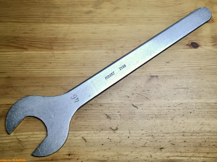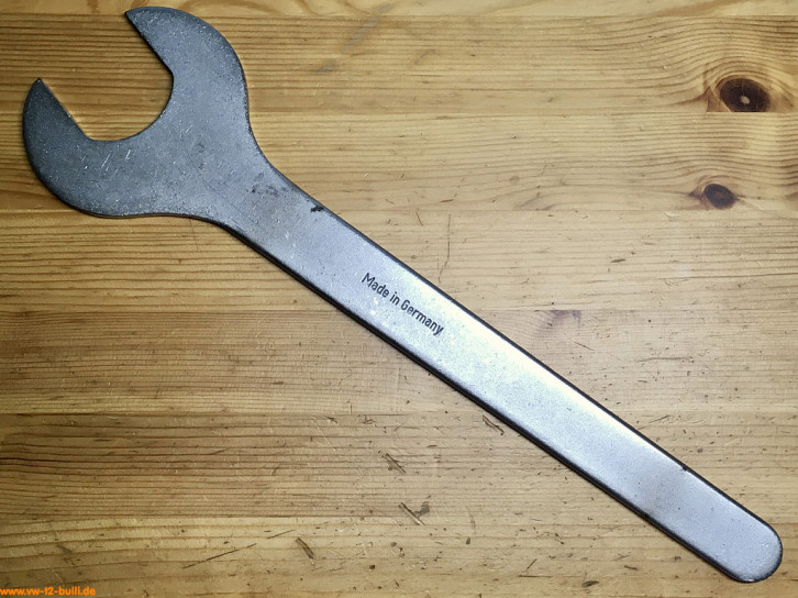 Dieser sehr große, besonders flache, 385 mm lange Schlüssel mit 46 mm Schlüsselweite wurde genutzt für das Ab- und Anschrauben des Gewindestutzens für Wärmetauscher am Auspufftopf am Typ 3 Motor. Er entspricht dem Volkswagen-Sonderwerkzeug "VW 180".