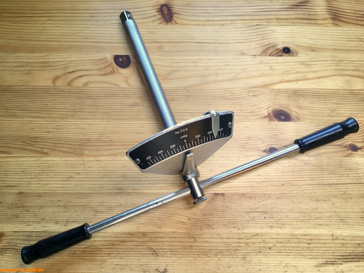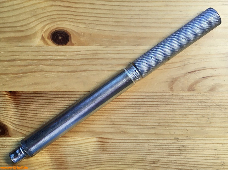 Dieser 270 mm lange Drehmomentschlüssel für 1/2" Steckschlüssel-Einsätze für maximal bis 6 mkg bzw. 6 mkp bzw. knapp 60 Nm diente zum Anziehen verschiedener Verschraubung an VWs. So laut Katalog 1958 mit 8 mm Inbus-Einsatz zum Anziehen der Lagerschrauben der Pleuelstangen (5 mkg), mit 10 mm Inbus bzw. 15 mm "2565" zum Anziehen der Zylinderkopfmuttern (3 mkg), mit 14 mm zum Anziehen der hinteren Gehäusemuttern (2 mkg) oder der Lagerschrauben der Pleuelstangen (5 mkg), mit 17 mm zum Anziehen der vorderen Muttern des Motorgehäuses (3 mkg). Für den zu nutzenden Wert hat das Werkzeug einen verschiebbaren und arretierbaren Merkerzeiger an einer Kette (Zeiger fehlt hier noch in den Bildern). Er entspricht dem Volkswagen-Sonderwerkzeug "VW 118".