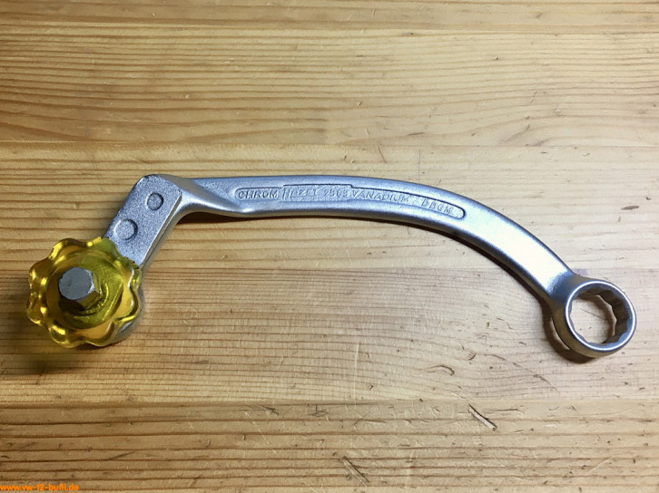 Dieser gebogene 150 mm lange Doppelringschlüssel mit 10 mm und 14 mm Schlüssel diente verschiedenen Aufgaben. die 10 mm für Befestigungsmuttern am Ölkühler bei Typ 1 und 2. Die 14 mm für Flanschschrauben am Vergaser und der Befestigungsschrauben der Auspuffrohre an der Schwungradseite.