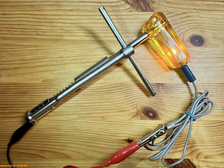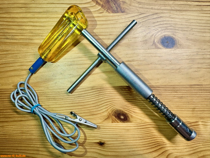 Dieses 190 mm lange Zündeinstell-Werkzeug mit gelbtransparenten Griff und grauen Kabel mit blauem Stecker war für VW Typ 1 und Typ 2 Fahrzeugklassen. Mehrere Werkzeuge, wie Prüflampe, Maul- oder Ringschlüssel, die für die Zündeinstellung erforderlich sind, werden durch dieses HAZET 2586 ersetzt.