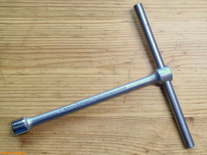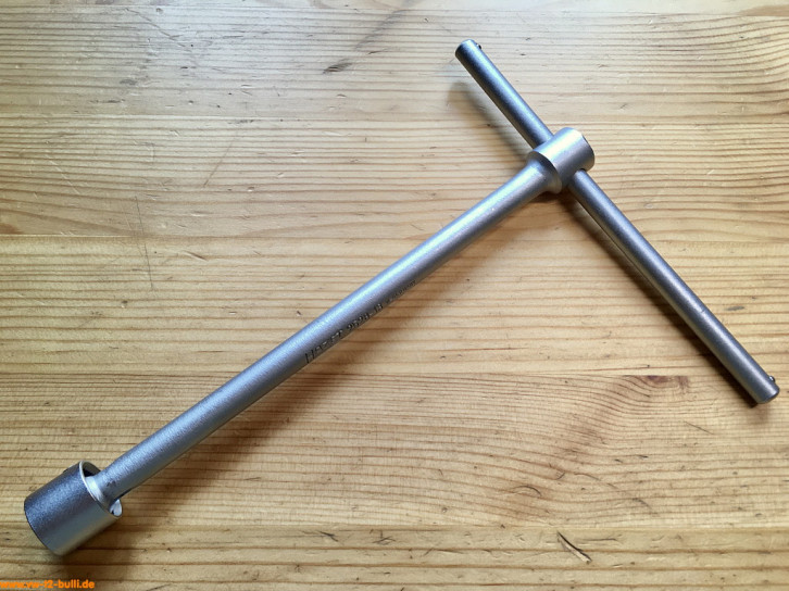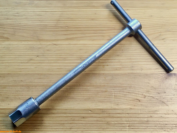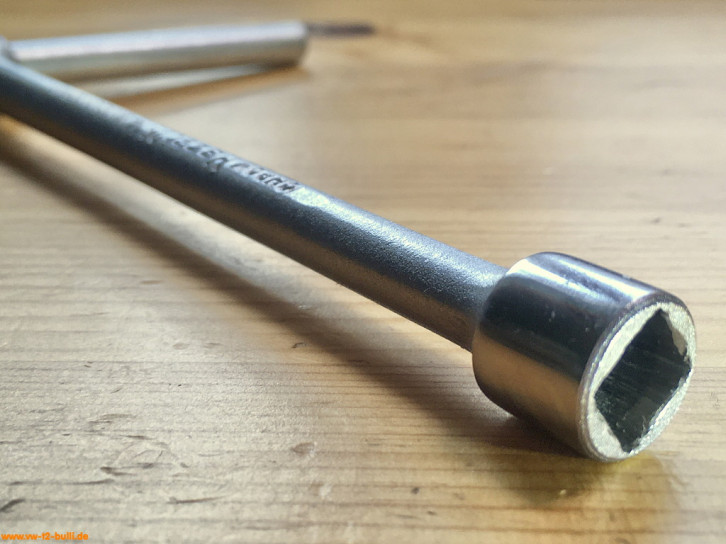 Dieser 150 mm lange T-Griff-Schlüssel mit 8 mm Innenvierkant diente zum Lösen und Anziehen der Spezialschrauben an der Schaltstangenkupplung und Schaltgabeln bei Typ 1 und 2.
