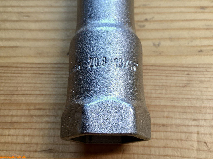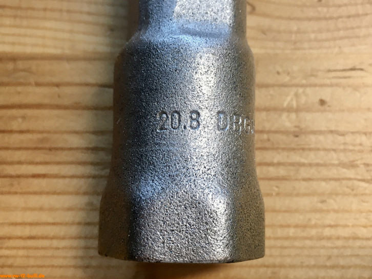 Ein mit einer Länge von 128 mm einfacher Zündkerzenschlüssel für 20,8 mm mit 190 mm langem, abgewinkeltem Stecker. Für einen Typ 4 Motor eher zu kurz und fummelig. Als kompaktes Bordwerkzeug für einen Typ 1 Motor vielleicht noch ok.