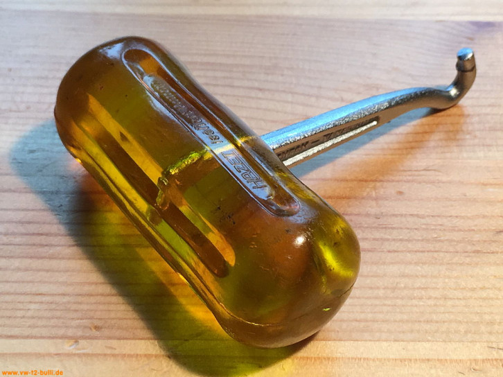 Dieser recht kleine 110 mm lange Spezialschlüssel diente dem Abnehmen, Einsetzen und Nachstellen des Kraftstoff-Dreiwegehahns bei älteren Typ 1 (Käfer & Co) und Typ 2 (T1).