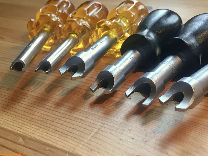 Diese 200 mm lange Kerbstemmer dient zum Sichern der Pleuellagerschrauben des Motors VW Typ 1, 2, 3 und 4 - und der Spezialmutter der Hebelbolzen der Kupplung VW Typ 1 und 2. Er entspricht dem Volkswagen-Sonderwerkzeug "VW 124".