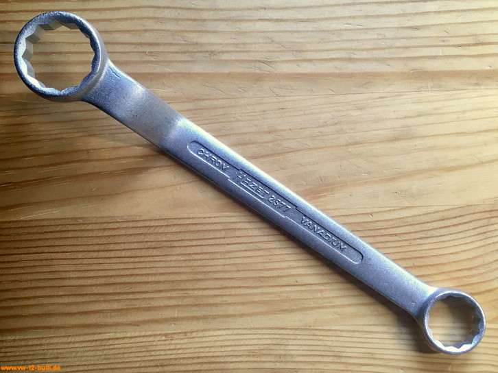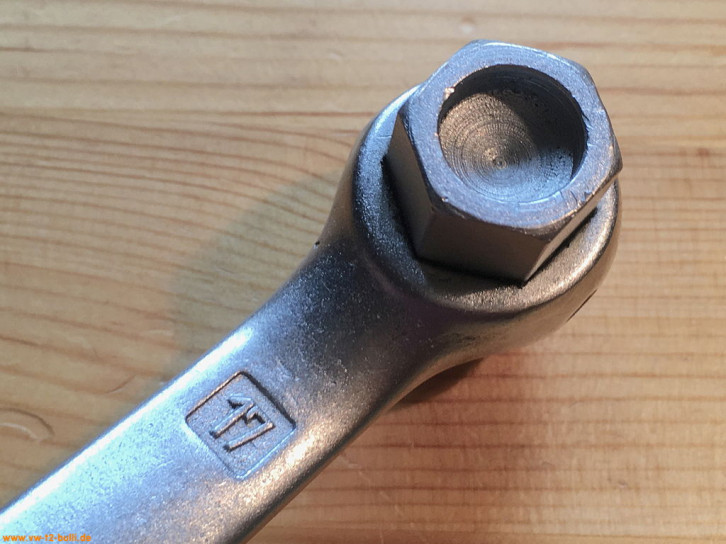 Dieser 200 mm lange Doppelringschlüssel mit 17 mm diente zum Anziehen und Lösen der Schrauben der vorderen Getriebeaufhängung und 22 mm zum Ein- und Ausbau des Rückfahr-Scheinwerfer-Schalters aller Typen ab Modelljahr 1966.