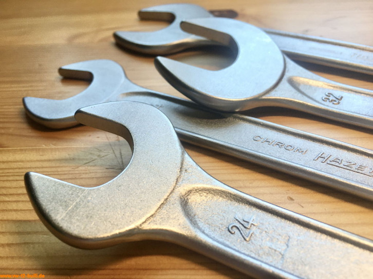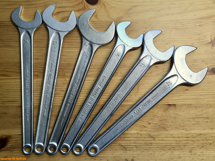 Diese 6 Stück 240 mm langen, einseitigen Maulschlüssel in den Größen 24, 27 und 32 mm mal als flache, gerade Variante "a" und mal gebogene Variante "b" dienten verschiedenen Aufgaben. Die 27 mm Variante entspricht dem Volkswagen-Sonderwerkzeug "VW 113", die 32 mm dem "VW 113a" und die 24 mm dem "VW 113b". Die 24 mm a & b dienten bei Typ 1 und 3 zum Einstellen der Vorderradlager. Die 27 mm a & b zum Einstellen der Vorderradlager der Nachstellhülse der Lenkspindel (Spindellenkung) bei Typ 1 und 2. Der 27 mm a auch für die Befestigungsschraube der Keilriemenscheibe bei Typ 1. Und die 32 mm a & b zum Einstellen der Vorderradlager Typ 2 T1. Die 3 gebogenen Varianten waren Teil der HAZET Werkstattausrüstung für luftgekühlte VWs.