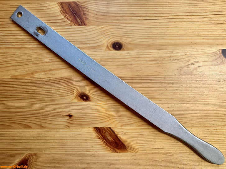 Diese 460 mm lange und x mm dicke Hebelverlängerung für die Führungsplatte "2511" ist Teil des 4-teiligen Sets 2510 für Schwungscheibe und Hinterachse bei Typ 1, 2 und 3. So für die Hohlschraube des Schwungrades, für Hinterachsmuttern und für die Spezialmutter für das Gebläserad bei alter Motor-Ausführung von Typ 1 und 2.