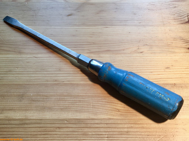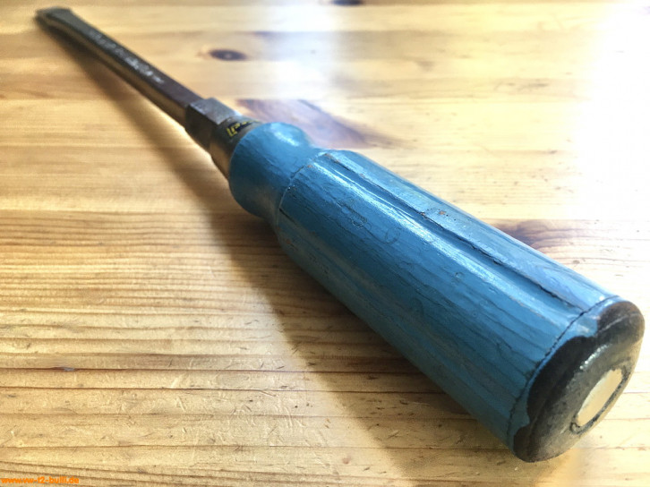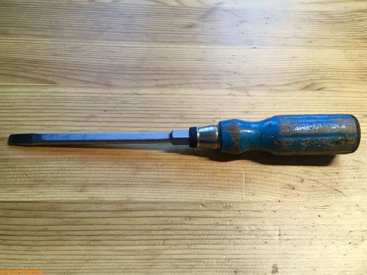 Dieser große Schraubendreher ist mit blauem Holzgriff und durchgehender Vierkantklinge mit Sechskant, gesenkgeschmiedet war Teil von Werkzeugschränken. Die Länge vor dem Griff ist 110 mm, die Gesamtlänge 230 mm, die Breite der Spitze ist 7 mm.
