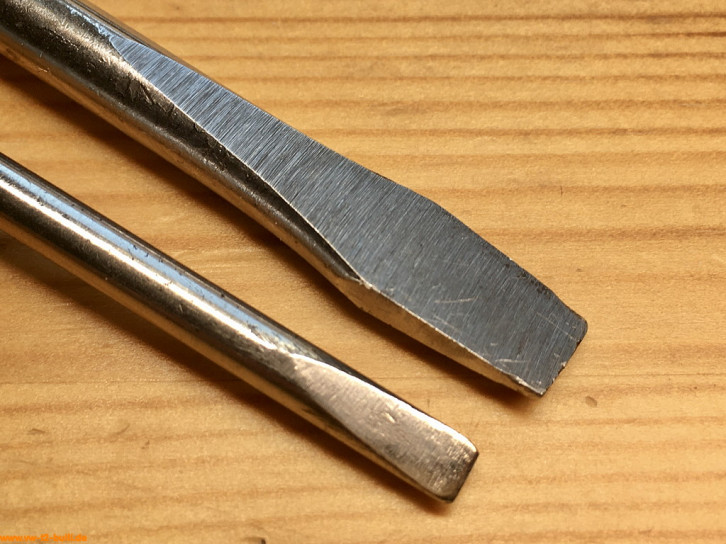 Diese Schraubendreher mit runder Klinge und Transparentgriff in rot sind isoliert, nach DIN 5265 Form A und waren weder Teil von Werkzeugschränke noch von VW Sets. Hier die Größen 5 und 8 - bei Größe 5 mit Gesamtlänge 220 mm ist die Länge vor dem Griff 125 mm, die Breite der Spitze ist 4,5 mm, bei Größe 8 mit Gesamtlänge 315 mm ist die Länge vor dem Griff ist 200 mm, die Breite der Spitze ist 8 mm.