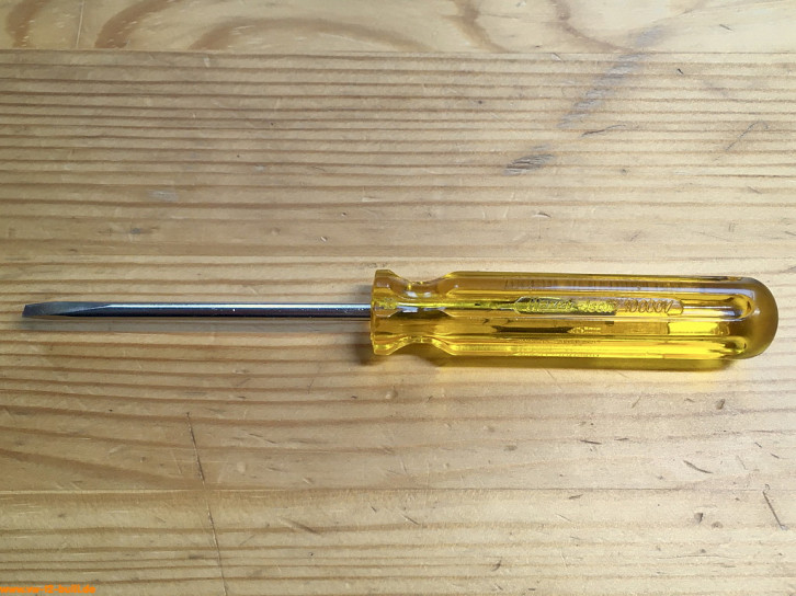 Dieser Schraubendreher war Teil von Werkzeugschränken. Die Gesamtlänge ist 135 mm, die Klingenlänge vor dem Griff ist 60 mm (hier eher 64 mm), die Breite der Spitze ist 2,5 mm.