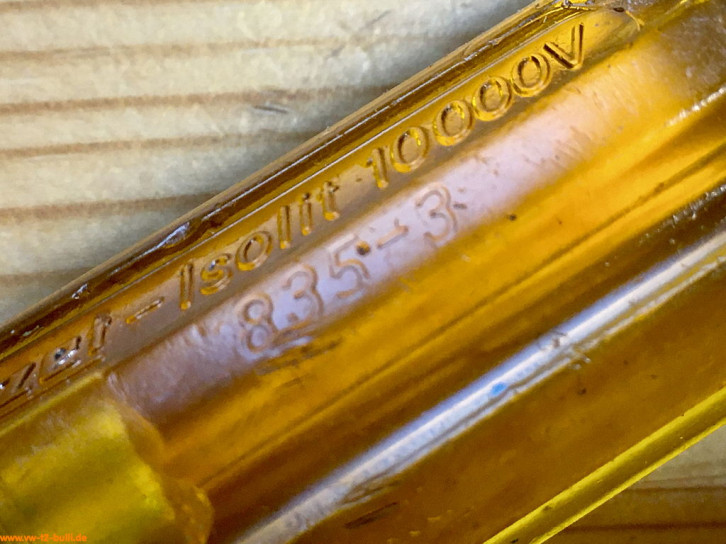 Aufschriften sind auf dem Griff "Hazet - Isolit 10000V", "ges. gesch. Germany" für "gesetzlich geschützt" - und auf dem Schaft "CHROM Hazet 832-4 VANADIUM".