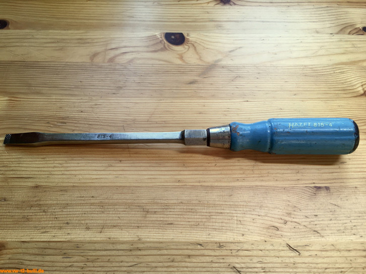 Dieser große 335 mm lange Schraubendreher nach DIN 5262 Form A für Kreuzschlitzschrauben (Phillips Recess) der Größen Nr. 18 und größer mit runder Klinge mit Sechskant und mit blauem Holzgriff gehörte zur HAZET Werkstattausrüstung für luftgekühlte VWs bis vor 1972 - danach durch 835 mit gelbtransparenten Kunststoffgriff ersetzt. Er war auch Teil des 3-teiligen Kreuzschlitzschrauben-Sets für VW 575/3 von 1954 bis vor 1958 bzw. 2575/3 1958 bis 1969.