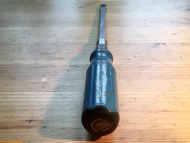 Dieser sehr große Schraubendreher ist mit blauem Holzgriff und durchgehender Vierkantklinge mit Sechskant, gesenkgeschmiedet war nicht Teil von Werkzeugschränken. Die Länge vor dem Griff ist 250 mm, die Gesamtlänge 390 mm, die Breite der Spitze ist 14 mm.