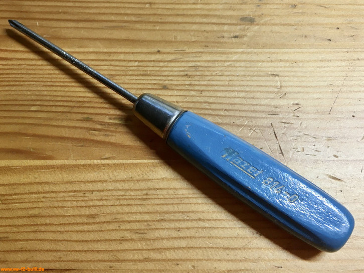 Dieser kurze Schraubendreher für Vergaser gehörte zur HAZET Werkstattausrüstung für luftgekühlte VW und auch andere Fahrzeuge. Die Länge vor dem Griff ist 25 mm, die Breite der Spitze ist 8 mm.