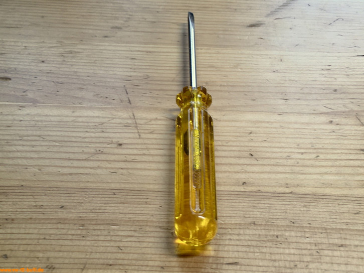 Dieser kleine Schraubendreher mit runder Klinge und Transparentgriff in gelb ist isoliert bis 10000V. Für VW Werkzeugschränke hatte HAZET damals eher die 831-2 mit Vierkantklinge oder längeren 832-4 vorgesehen - heute selten im guten Zustand. Die Länge vor dem Griff ist 75 mm, die Breite der Spitze ist 5 mm.