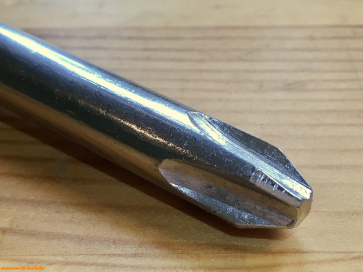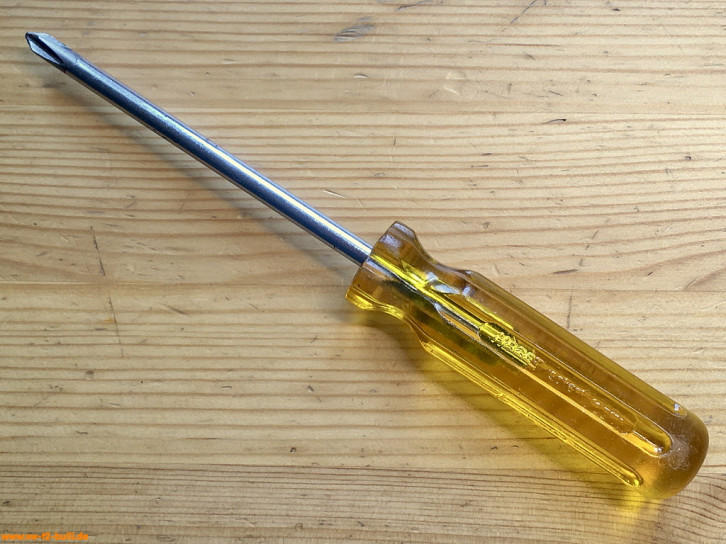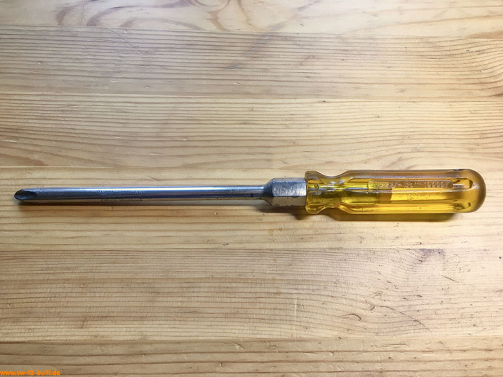 Dieser Schraubendreher DIN 5262 für Kreuzschlitzschrauben (Phillips Recess) mit runder Klinge und Transparentgriff in gelb ist isoliert bis 10000V und gehörte zur HAZET Werkstattausrüstung für luftgekühlte VW und auch andere Fahrzeuge. Die Länge vor dem Griff ist 100 mm, Gesamtlänge 195 mm, die Spitze ist für DIN 5262 - Größe 2 (USA 5-10).
