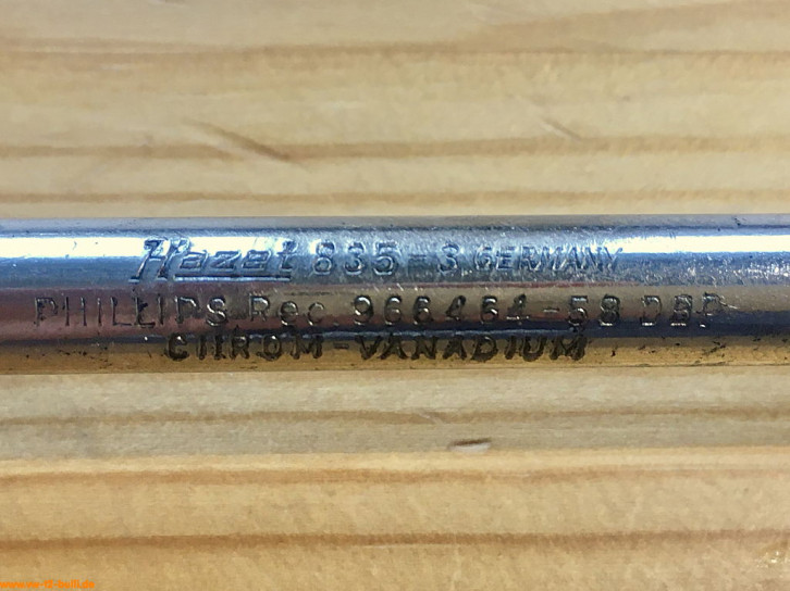 Aufschriften sind "HAZET isoliert Germany" und "CHROM-VANADIUM, Made in Germany"." auf dem Griff und auf dem Schaft "HAZET 835-1 GERMANY", "PHILLIPS Rec. 966464-61 DBP." und "CHROM-VANADIUM".