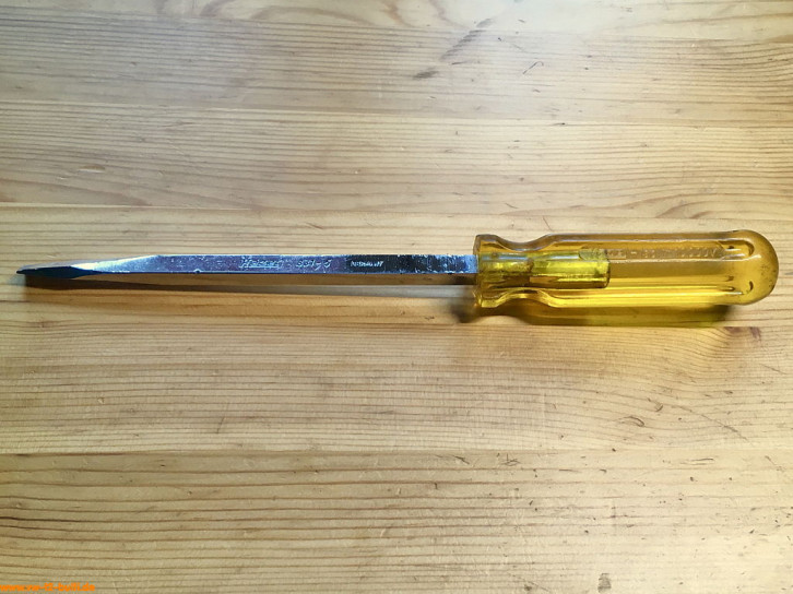 In HAZET Katalogen gibt es ihn auch schon ab 1963. Und erst 1976 erscheint der "HAZET 815-3" Schriftzug auf dem Griff (vorher im Katalog auf der Klinge). Bis vor 1976 ist die Spitze 9 mm breit, danach in den Katalogen als 8 mm breit geführt. Bis mindestens 92 findet man ihn noch, in den Katalog von 2000 nicht mehr in blau aber mit Holzgriff - aber in 2020 Katalogen nicht mehr.