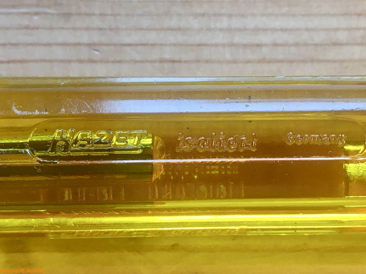 Aufschriften sind "Hazet isolit", "ges. gesch. Germany" für "gesetzlich geschützt" und eingeprägt "CHROM VANADIUM" und 834-4-" (man erkennt bei meinem nur noch die "8" und "-4" - die Abmaße stimmen aber mit dem Katalog überein).