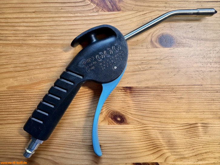 Diese 255 mm lange Ausblaspistole ist geräuschreduziert mit Handgriff aus nicht wärmeleitenden Acetat-Kunststoff ersetzt bei mir ein billige schwere NoName Pistole, die schnell auskühlt und lauter ist.