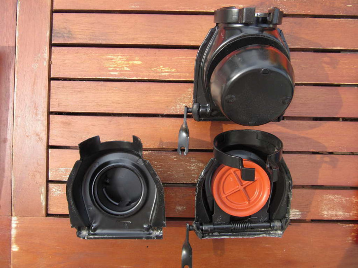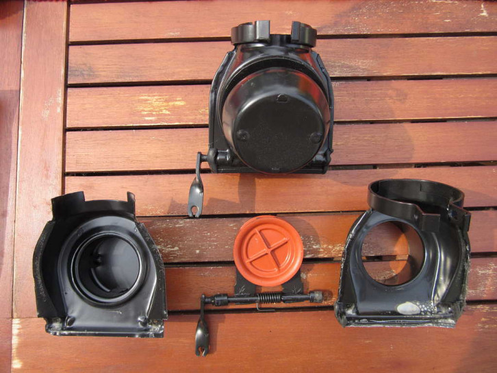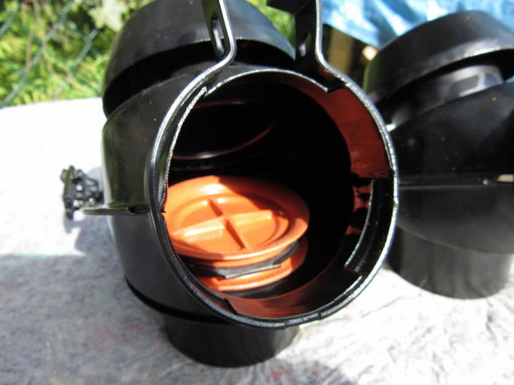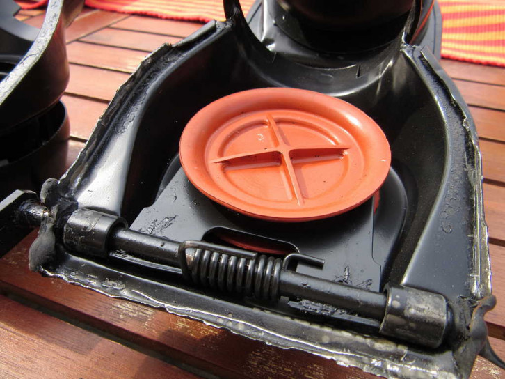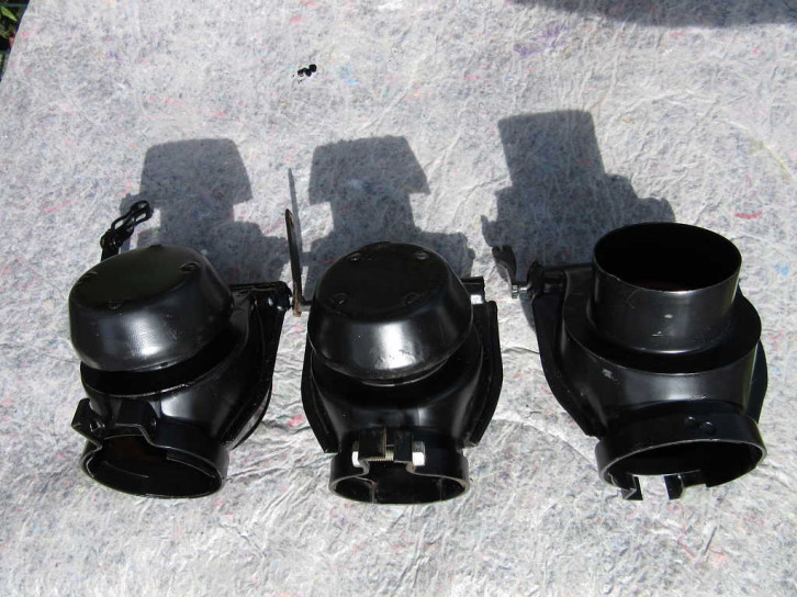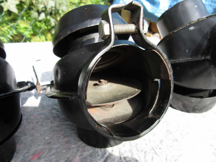 Hier im Vergleich die beidem Heizklappentypen. Mit oranger Gummiheizklappe die vom T3 - die schwarz/graue Blechklappen sind Repro-Heizklappen für den T2.